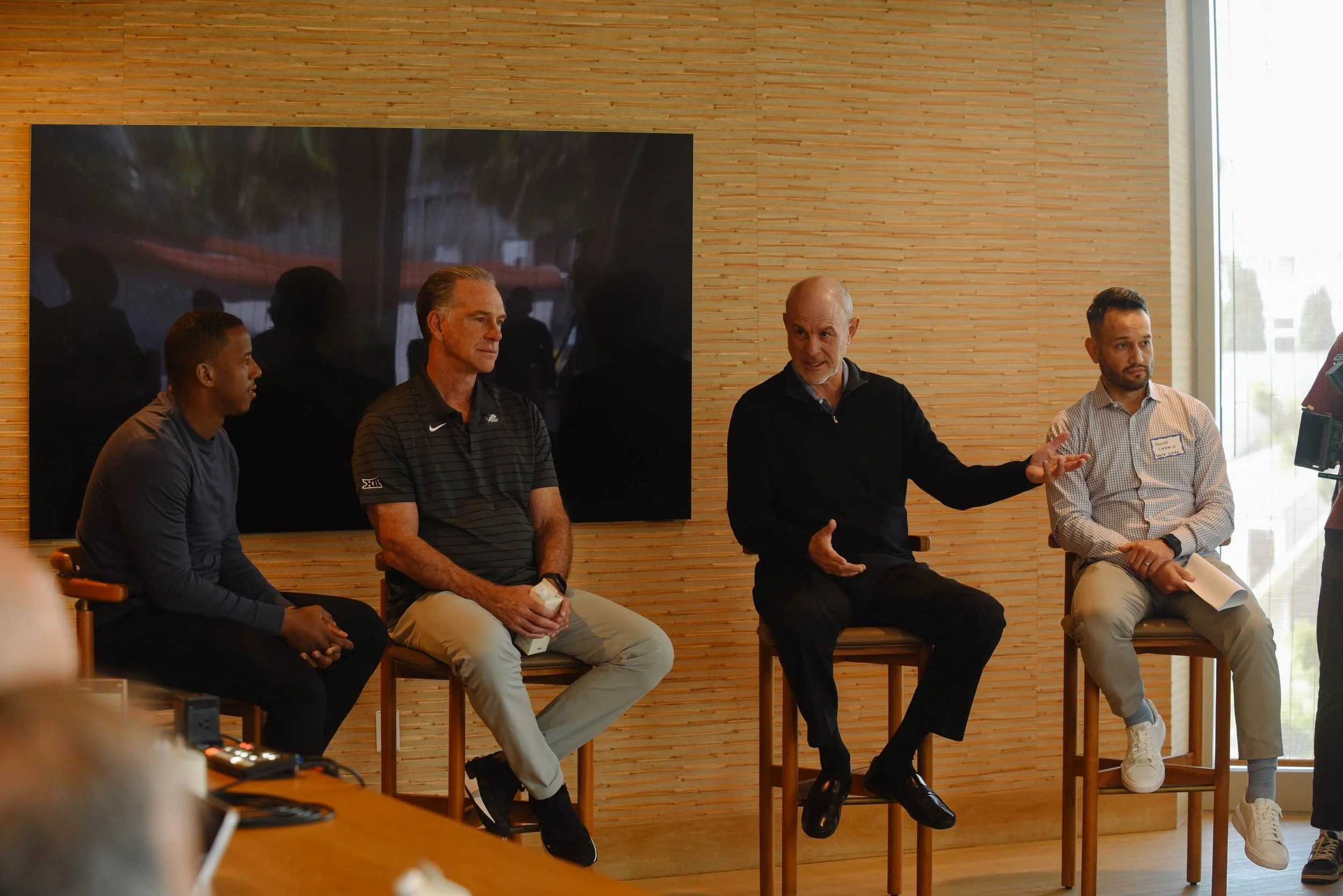 Four men sitting on stools engaged in a panel discussion in a modern room with a large TV screen behind them.