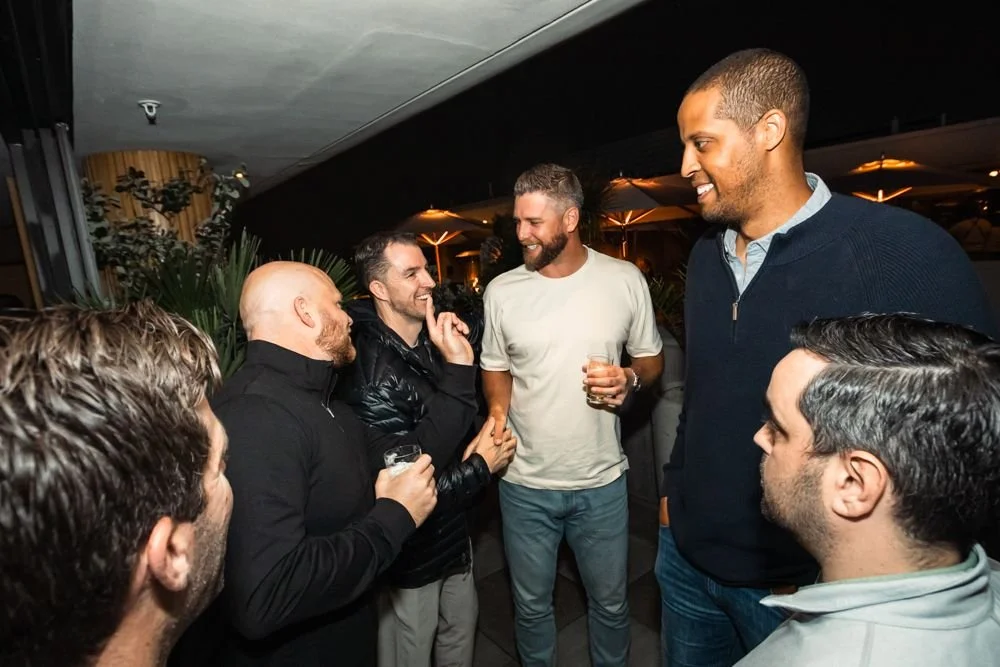 Group of six men standing and conversing at an indoor gathering, with some holding drinks.